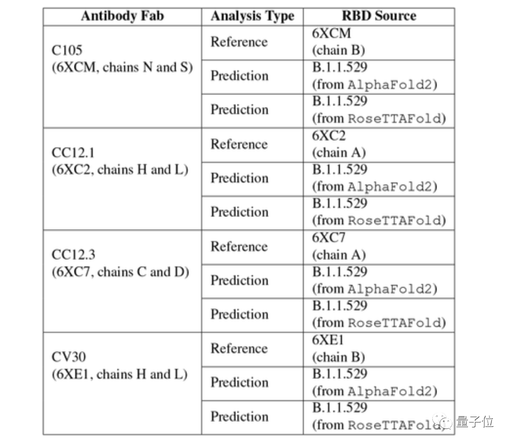 在这个步骤中,Ford团队基于上面得到的奥密克戎RBD预测结构,模拟了与四个现有中和抗体结构的相互作用(分别为C105, CC12.1, CC12.3, and CV30)。