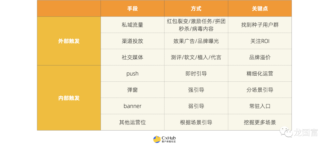 触达大致分成外部触达和内部触达,也就是产品外的流量和产品内的流量,不同的手段都有非常多的方式,每个方式都有关键要素。