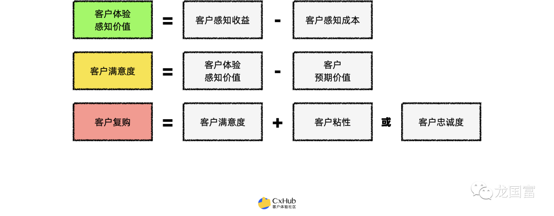 Okay,那我们先看讲第一个公式,客户体验感知价值 = 客户感知收益 – 客户感知成本。