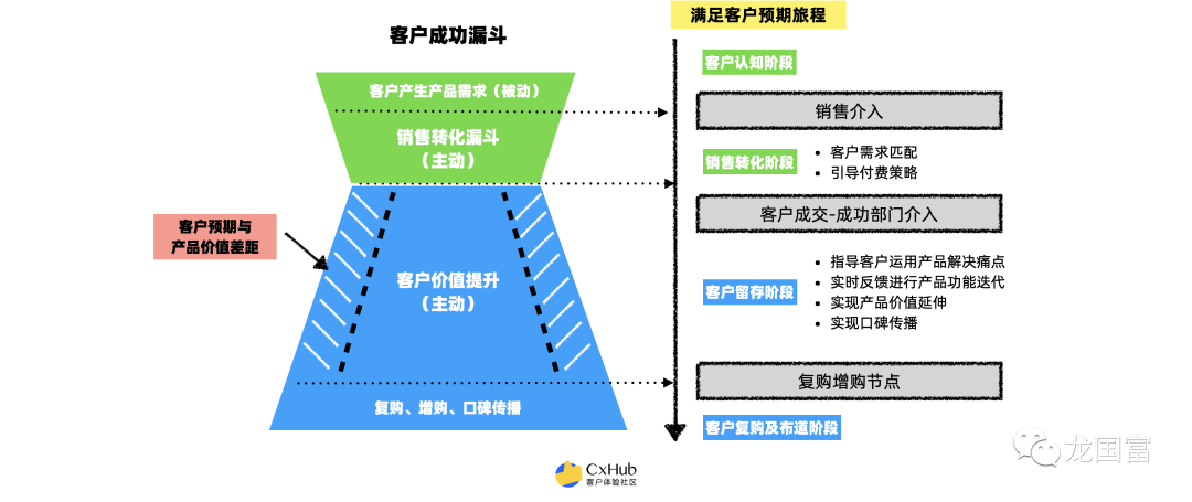 为了应对客户预期的期望,SaaS 平台要想获得客户的满意,那就需要从客户成功的漏斗触发了,在不同的阶段主动介入,在旅程中帮助客户价值提升,以满足预期,提高满意度。