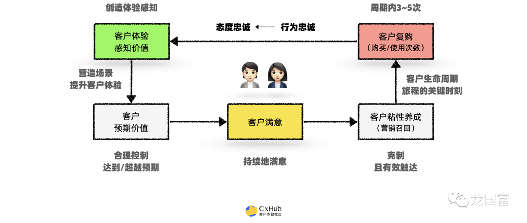 最后,通过客户持续的满意、口碑推荐,客户生命周期的体验管理,达成真正意义上、态度和行为两者兼具的客户忠诚。