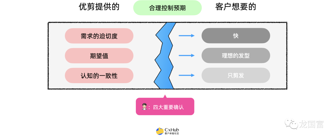 在剪发这个事情上,从需求的迫切度、期望值和认知一致性来看客户预期,那对应的就是:快 + 理想的发型 + 只剪发。