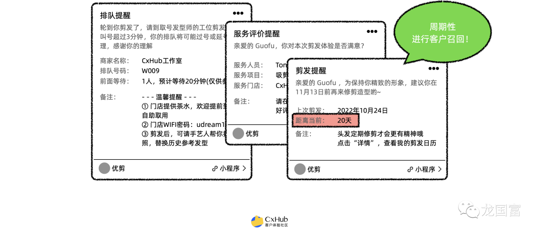 优剪依据这个洞察,在顾客召回的设定上,依据顾客自上次理发起计算 20 天,一条提醒剪发的微信模板消息,就会主动推送到顾客的微信上,让他知道“到时间理发了”。
