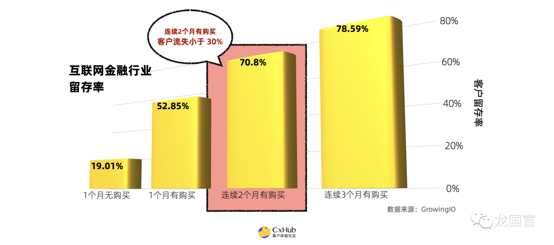 比如,互联网金融行业的留存率,我们可以看到一个月没有购买的客户留存率仅为 19.1%,有一次购买的留存率就可以达到 52.85%。从图表中可以看出,当新客户在连续 2 个月有购买,留存率就会达到 70.8%,这个就是我们要找的客户粘性养成周期观点。
