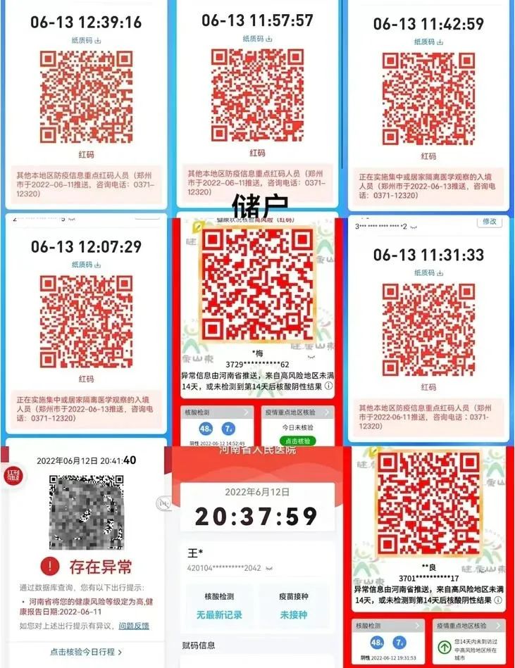 6月13日,很多网友在社交平台反馈,多名扫码进入“取款难”储户维权群而欲前往郑州沟通村镇银行沟通取款事宜的储户,其健康码都被赋红码,这其中既包含已达到郑州即发现健康码变红的储户,还包括多位尚未前往郑州,仅在填报完信息后就被神奇赋予“红码”的储户。