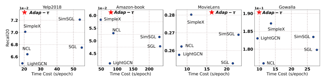 最后,我们将模型与近两年 SOTA 模型进行时间与性能的统筹考量,由图可知,本模型均可实现较优的平衡,在时间复杂度不增加的情况下,效果达到最佳。