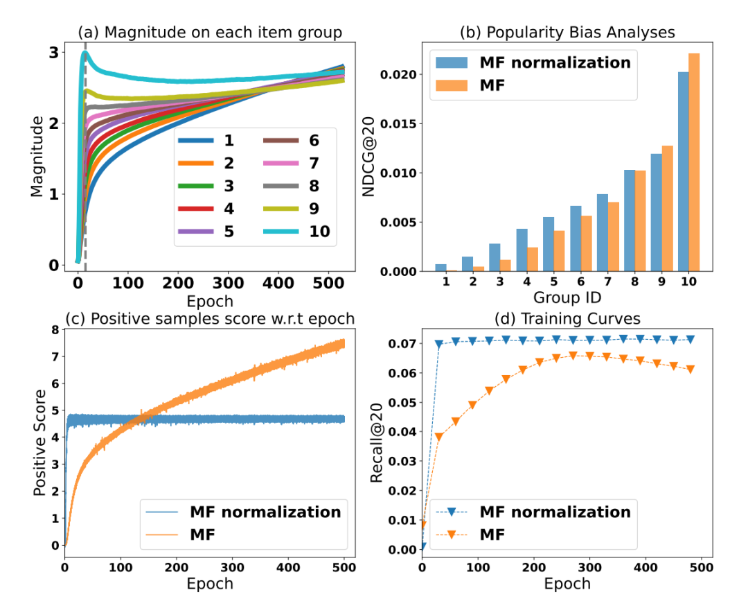 如果我们关注预测分数变化情况(图左下),我们观察到,即使在训练后期(例如 500),基于内积的 MF 预测分数和表征模长仍然处于上升而非收敛的状态,而与此同时性能持续下降(如图右下)。有趣的是,一旦利用归一化时,我们观察到了模型极快收敛,并且后续一直表现稳定。