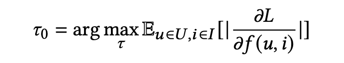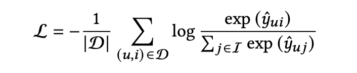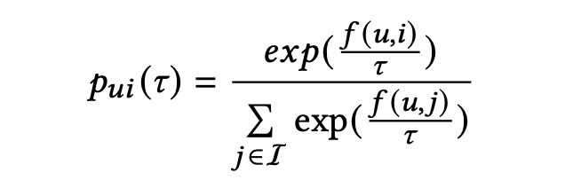 用于训练推荐模型的损失函数有多种选择,包括 pointwise loss(例如 BCE,MSE),pairwise loss(例如 BPR)和 Softmax 损失。最近的工作 [1] 发现,Softmax 损失可以减轻流行偏见,实现良好的训练稳定性,并与衡量指标(ndcg)有一致性关联。此外,Softmax 损失可以被认为是常用 BPR 损失的扩展。因此,我们将 Softmax 作为分析的代表性损失,可以公式化为: