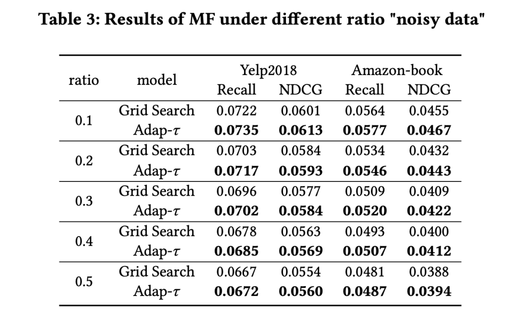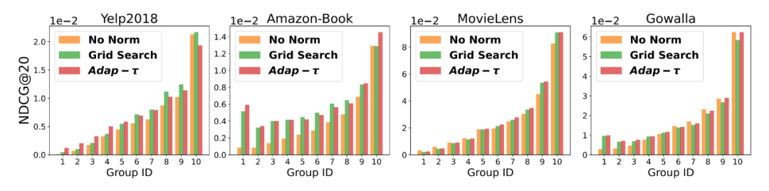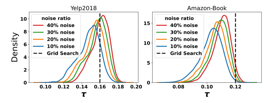 同时对于局部自适应,我们记录各个组别下 𝜏 的分布情况,由图可知我们的策略确实可以在用户间实现细粒度的调整,即噪音比例越小,温度系数值越小;反之亦然。
