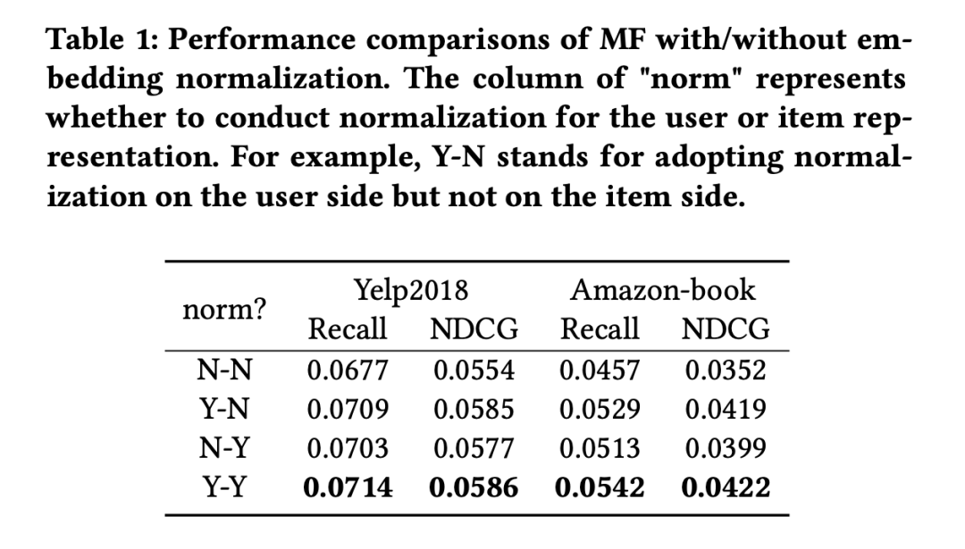 为了进一步验证归一化的优势,我们测试推荐性能,变量为是否对用户或物品表征进行归一化(下表)。可以看出,具有双侧归一化(即对用户和物品的表征都进行归一化操作,记做 Y-Y)的模型显著优于具有单侧归一化(即 Y-N 或 N-Y)的模型;并且它们都超过了没有归一化的模型(N-N)。