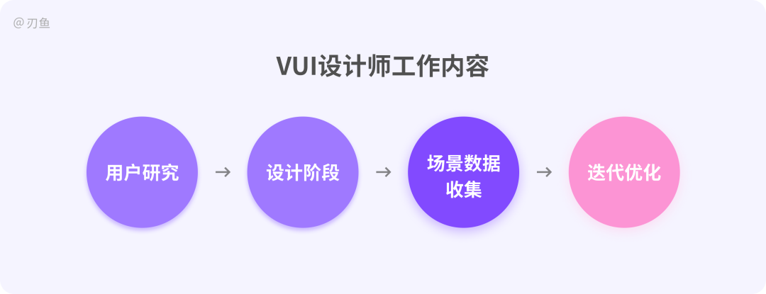总结来说,VUI设计师的工作内容分为四个部分,依次分别是:用户研究、设计阶段、场景数据收集、迭代优化。