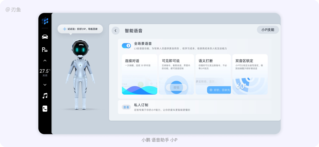③ 拟人型:卡通、五官明显、表情丰富、IP化、生动活泼(例:小鹏语音助手小P)。