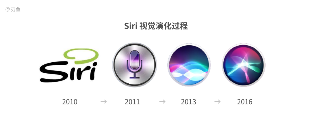 通过下图Siri的视觉变化过程图,我们能够明显看到Siri的视觉形象由一开始的拟物化麦克风造型,逐步变为抽象型的伴随着光效变化波动的圆。Siri是一个典型的由传统型向抽象型演化的例子。