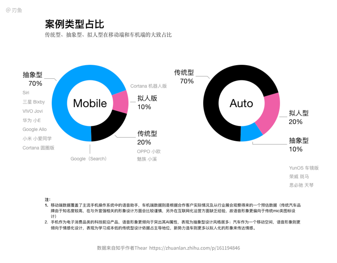 通过下图我们可以看到传统型、抽象型、拟人型语音视觉形象在移动端和车极端的大致占比。