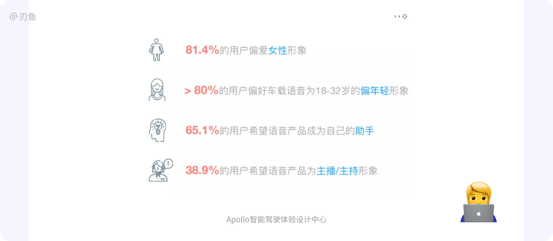 根据其调研结果,在基础属性中,喜欢女性声音形象的人占据最多的人数,大于80%的用户青睐18-32岁的偏年轻的语音形象。超半成的用户希望语音产品成为自己的助手,低于半数的用户希望语音产品为主播/主持形象。