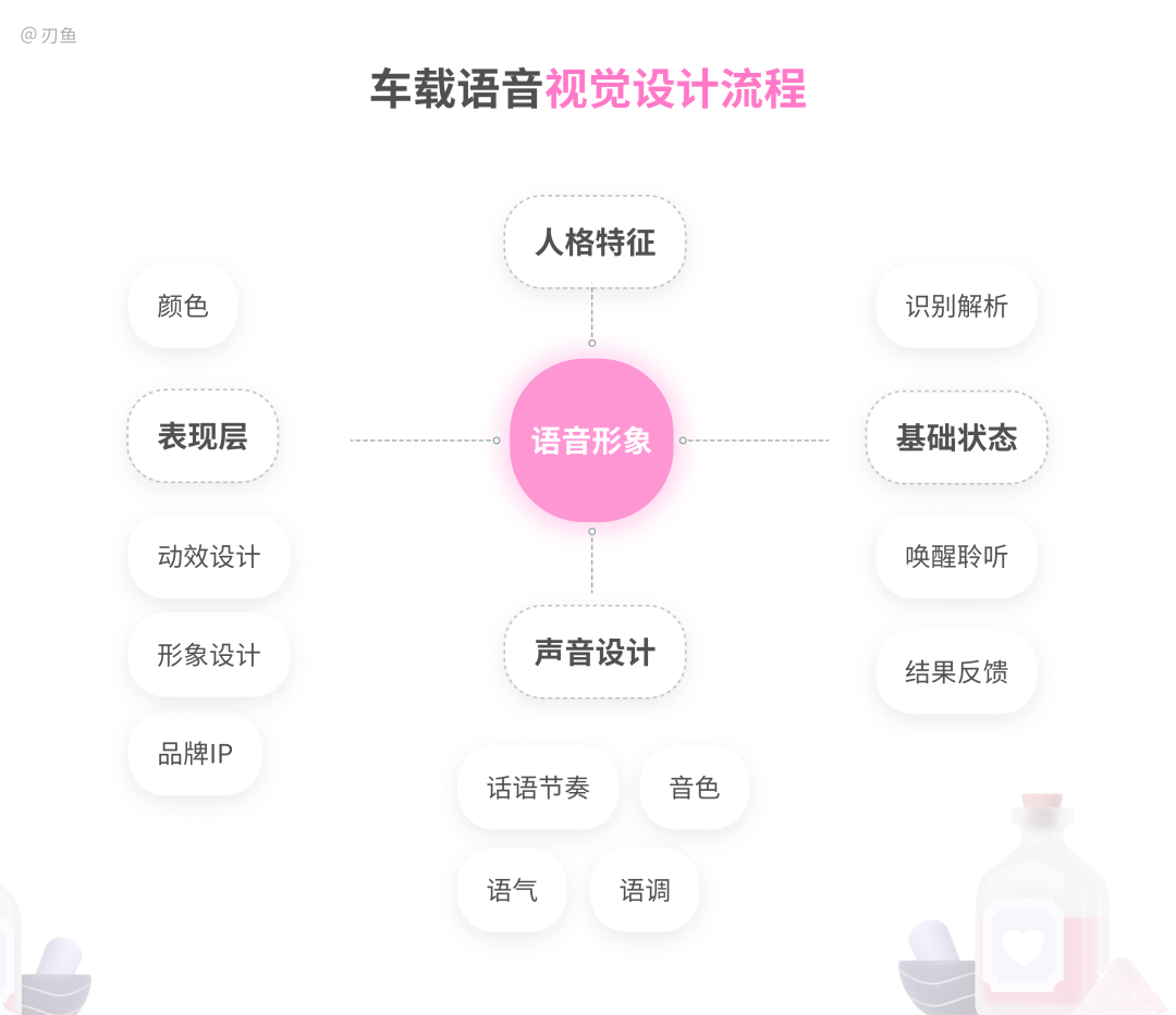 车载语音形象设计流程包含人格特征、表现层、基础状态、声音设计几个方向,每个方向又包含若干设计模块。
