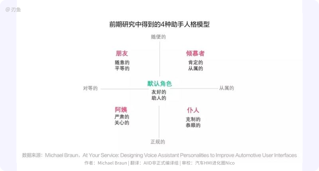 前期研究阶段:Michael Braun设计了8种语音助手人格,包含“主导 / 顺从”和“敌对 / 友好”几个人际交流间的基本维度,并在 6 个驾驶场景(3 个与驾驶相关,3 个与娱乐相关)下,邀请 19 名非 HCI 专业人员分别与 8 名助手进行对话,了解他们对语音助手人格特征的需求偏好。