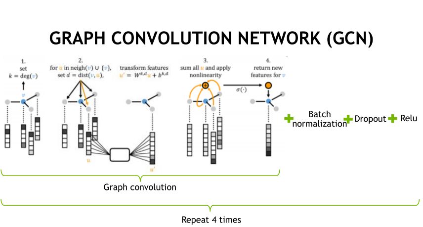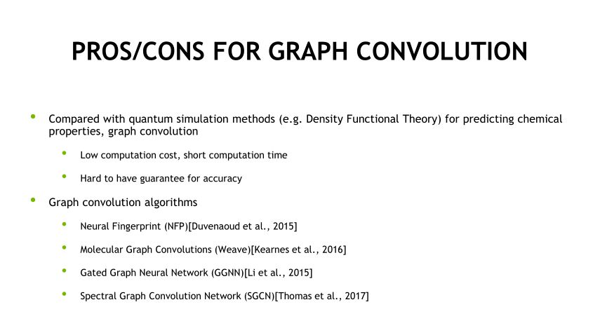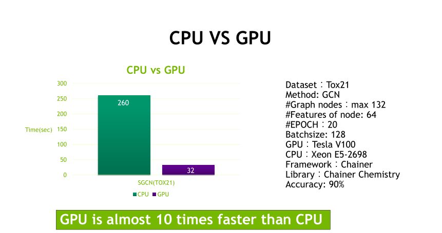 做卷积时,会执行一些非线性的操作,生成一些新的特征,然后应用到节点上,图卷积的过程之后加上Batch normalization、Dropout和Relu,重复四次,就是整个图卷积的结构。通过这样的结构,就能把分子的状态应用到CNN领域。不像以前,由于分子的结构是非矩阵型的,不能够进行应用,而和应用相比能不能带来加速呢,下面我就会给大家讲一下。