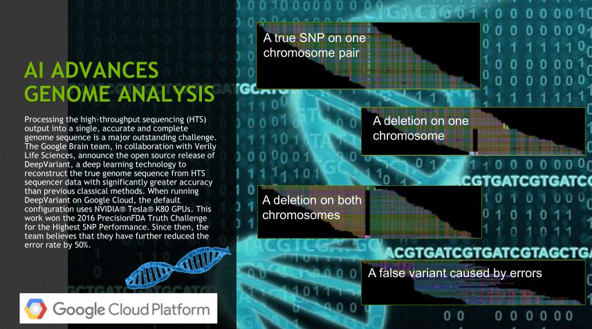 对于人来说,两对染色体包含30亿个碱基对,包括了鸟嘌呤、胞嘧啶、腺嘌呤、胸腺嘧啶,组成二十三对染色体。但是我们这些仪器能够产生十一个短序列,我们称之为Read,每个read仅代表了三十亿个碱基中的一百个,每个碱基的错误概率在0.1%-10% 之间,把单一的、小的基因序列完整而准确的拼起来是很困难的。这个时候Google cloud platform提出了开源的方案叫做DeepVariant,通过以编码HTS仪器数据的方式,生成了数千万个训练样本,然后用这个训练样本,基于TensorFlow做图像分类,以便从仪器生成的实验数据中识别出真实的基因组序列。通过这样的方式,可以很简单的判断哪个基因组序列是正确的。在右边的图上,有四种基因组序列:正常的染色体、有一个碱基出现问题的染色体、两个染色体对都被删除,还有一种情况就是由于一些其他因素,比如在最开始做生成的时候复制出错等相关问题,就会出现最后一种图像,通过这样的方式,就能加速基因测试的过程。