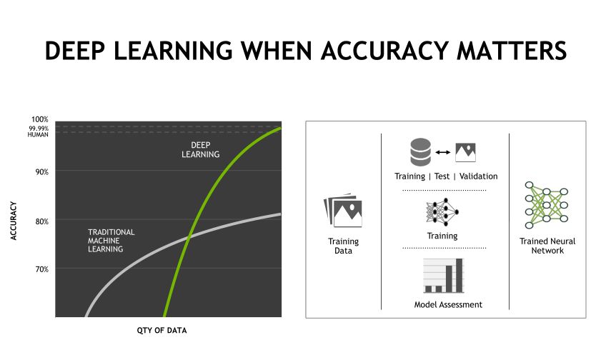 大家知道,2012年AlexNet网络出来之后,首先在ImageNet上取得了非常好的结果,战胜了传统记忆学习的方法,当时AlexNet性能有10%的提升。而在往年,每年都是1%的性能提升。这样飞跃的性能提升确实能够丰富我们的应用种类,比如人脸识别,自然语言处理。同时对于一些商业应用来说,能够获得更精准的推荐,比如大家平时使用的今日头条新闻推荐,系统会根据你自身的的喜好为你推荐相应的内容,这就是基于深度学习来做的。对于深度学习来说,这样的精确意味着什么呢?