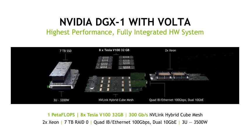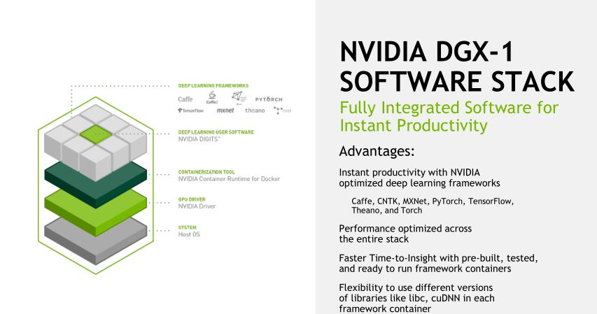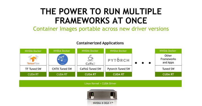 在GPU之上,NVIDIA还提供各种GPU Docker容器,比如Caffe,Caffe2,TensorFlow,PyTorch,Chainer等,这些容器和驱动以及Docker,包括精简过的OS,驱动都是专门为DGX配置的,而且上面的容器都基于GPU的特性做过优化,从而保证大家能够用到最好的计算性能,训练出自己的GPU模型,为客户提供应用。