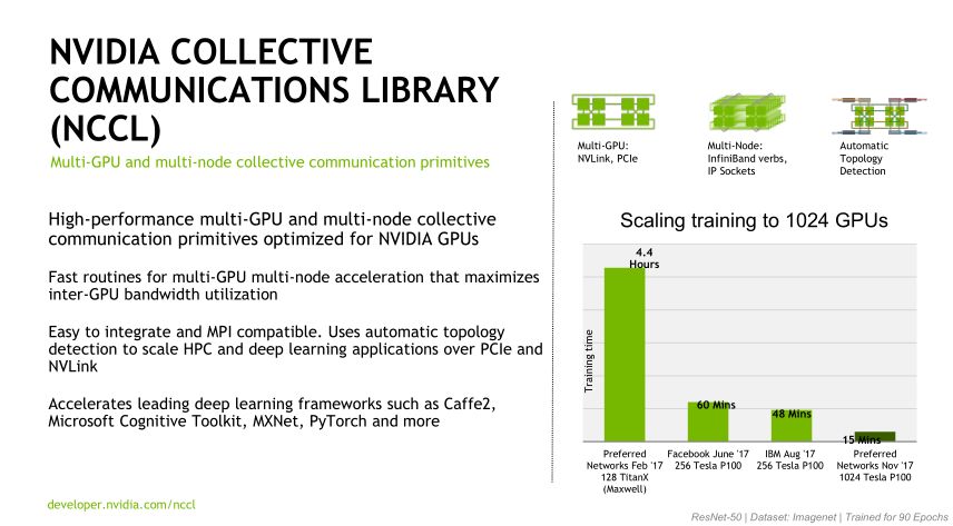 NCCL用于多GPU之间的通信,使用通信算法,底层采用NVLink,PCIe和 InfiniBand,同时能够去检测到整个系统的拓扑结构。从上图可以看到最开始的Maxwell,以及两个P100的比较,然后到1024个P100,可以看到用NCCL在GPU通讯方面能够达到线性的加速,也意味着通信的开销不会导致训练的延时,这个是非常难做的。有HPC (高性能计算) 背景的朋友都知道,能达到线性的加速是非常难的一个任务,而NCCL在通信方面取得了这样的效果。