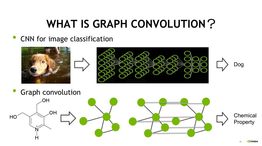 既然可以用GPU和深度学习来加速,到底该怎么具体操作呢?如果有做视觉的同学,可能知道是从CNN开始,能够取得一个好的效果,其实就是从图片的分类开始。结果很简单,就是用卷积核在图片上面做卷积,然后经过各种隐藏层的计算之后,可以判断图片内容。图片是一个很简单、很规整的RGB数据 ,但是对于药物发现来说,药物的结构并不是一个规整的矩阵,该怎么来做呢?