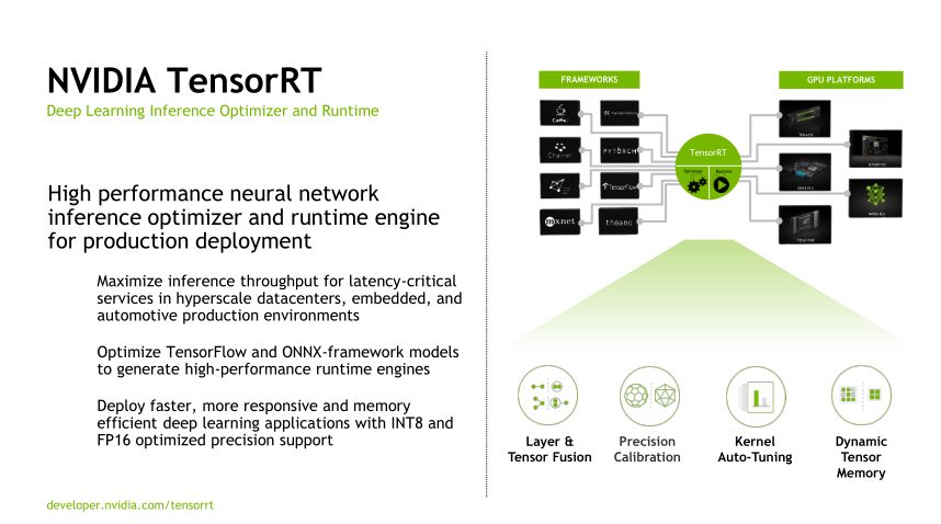 最后一个我想讲的是TensorRT,训练好一个模型,最重要的是模型的准确性和怎么把模型交付给客户使用?推理和训练其实是不一样的,训练时可能用的是FP32的精度,但在推理的时候,可以用更低的精度。训练时,各层之间的关系是固定的,而且需要把中间参数保存下来,从而进行反向迭代。但推理时,只有正向的迭代,此时可以通过使用TensorRT达到免费加速的效果。TensorRT可以做一些Layer fusion,同时也可以做些精度校准,对于不同的GPU卡,可以实现模型的自动调整,动态分配内存,不管是在内存、计算、网络结构以及参数精度方面,都可以用TensorRT达到更好的效果,取得一更好的性能。以P4为例,如果使用FP32精度的参数算力可以达到5.5T,如果使用Int 8精度的参数算力可以达到22T,所以说硬件的性能提升也需要通过软件的优化才能够完成。