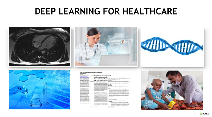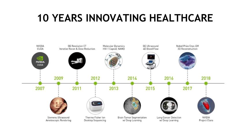 对NVIDIA不熟悉的朋友,可能对NVIDIA的印象还停留在GPU的计算卡和游戏卡上,但其实从2007年NVIDIA提出CUDA用于作为GPU计算的编程语言开始,我们已经在医疗行业耕耘了十年。可以应用的领域除了计算之外,还有可视化,而现在,我们还可以用来做深度学习。有宝宝的小伙伴应该知道,做婴儿三维超声波检查的时候,看到婴儿的那些图像,其实从2009年西门子的超声波机器已经用NVIDIA的GPU来做渲染方面的工作。