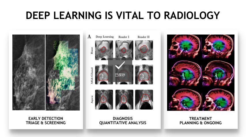 2012年,由于AlexNet的出现,深度学习证明了其在计算机视觉方面具有非常好的性能,也就是从这个时候开始医疗行业的各个领域也逐渐开始利用深度学习,也扩展了GPU的应用领域,比如在2013年,GPU驱动的深度学习的方法,在病理切片上检测并统计有丝分裂数,击败了其他所有的技术,这个统计数据是癌症的早期指标,换句话说,用GPU之后我们能够获得更好的准确性,同时也能降低漏诊的风险。