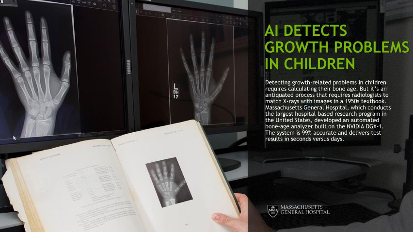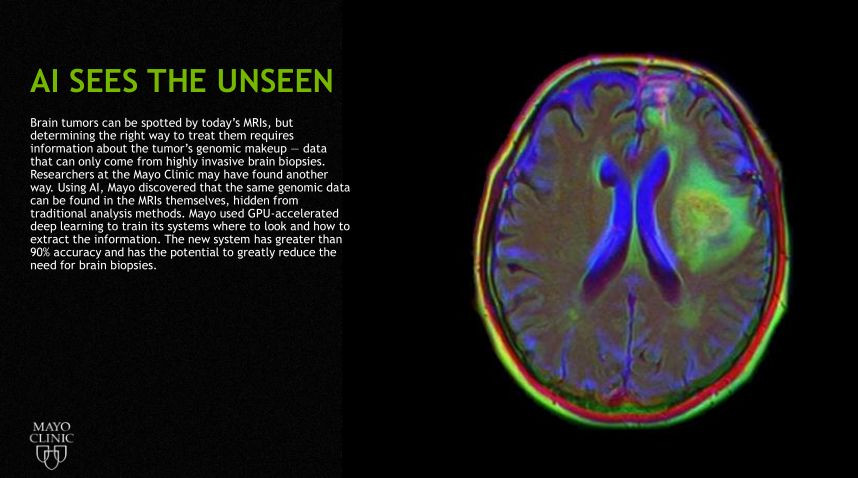 另外一个让人非常兴奋的领域是精准医学,上图右边展示的是脑部扫描图片。在面对某些脑癌的时候,医生有能力去判断需要什么药物,问题是医生不可能在大脑上打个洞,然后去切片,再去分析,现在通过脑部的MI扫描方式,用深度学习神经网络去判断和预测患者肿瘤突变的概率,目前准确度也超过了90%,使得医生可以用精准的药物去帮助病人做治疗,减轻他们的痛苦。