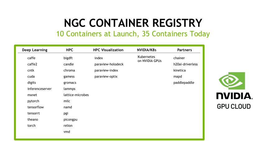 目前NGC提供的容器镜像有35个,分别在不同的领域,包括深度学习、HPC、HPC的视觉、Kubernetes以及我们的合作伙伴提供的各种容器镜像。