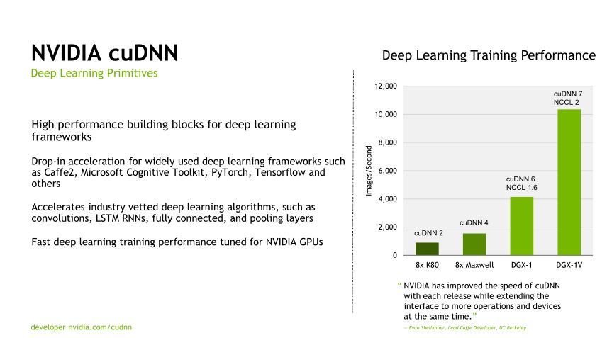 cuDNN是一个高性能深度学习神经网络加速库,被利用到所有的深度学习框架中,包括Caffe、Caffe2、CNTK、TensorFlow、PyTorch等,都在用cuDNN做加速。当然如果需要写自己的软件,也可以用cuDNN来加速,从上图可以看到从最开始的8个K80,到8个Maxwell,再到DGX-1和DGX-1V,在不同的cuDNN版本和不同的硬件上,其性能差距是非常大的。在深度学习的训练方面,从最开始的1000张不到,现在可以训练的图片大概超过10000张,能够进一步加速训练,带来10倍的加速提升,而这样的加速对于开发成熟的产品是非常重要的。