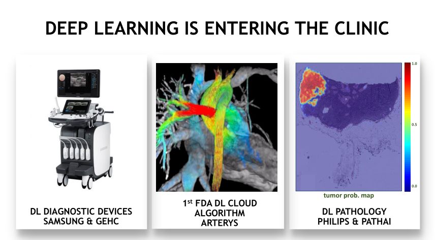 第二个领域是深度学习在诊所里的应用,三星和通用的扫描仪已经在使用深度学习来优化整个工作流,提高准确性。比如婴儿三维超声波检测时,可以冻结一些图像进行测量。第二个ARTERYS公司,也是首批通过FDA认证的公司。通过与GE合作,把他们的工具带到了心脏病专家那边,进行所有相关的一些检测,能够进一步提高护理质量。最后一个是PATHAI与飞利浦合作,也是第一个由FDA批准的扫描仪诊断,通过将病理图片与热力图结合,帮助病理学家分析肿瘤的情况,进一步降低病理学家诊断错误率,大约降低50%,使得病理学家在看图的时候能够更加方便。