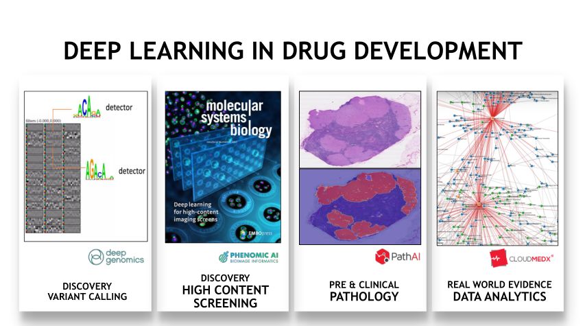 第三个是深度学习在药物发现方面的应用,第一个是deep genomics公司。他的成立要追溯到2002年,当时Brendan Frey的妻子怀孕了,在做检查的时候发现孩子有遗传缺陷,虽然只是可能,但是他们不得不终止妊娠。Brendan Frey是计算机工程的教授,所以他开始尝试把深度学习和医疗结合到一起,要解决的痛点是人群中的DNA的变异数,突变概率大于1的SNP(单核苷酸多态性)有三百万个左右,要完全的挨个调查SNP和疾病的关联非常困难,因此要建立一个数学模型导入全部的健康基因组序列和SNP序列,对模型进行训练,让模型能够学习到健康的RNA(核糖核酸)的裁剪模式,然后用分子生物学的方法验证模型,并加以校验,同时用病理数据,判断模型输出的准确性,从而理解有害基因和基因突变病理之间关系,再做一些初步筛选,把有害基因和基因突变病理关系建立起来。