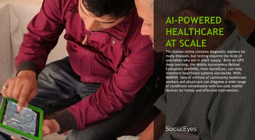 上图展示的是用SocialEyes,基于我们的NVIDIA SHIELD 平板电脑上,可以利用里面的GPU,运行深度学习的模型,去判断眼部疾病,因为在一些偏远地区看眼科是非常难的,通过这样一些模型,就能够解决这些问题。