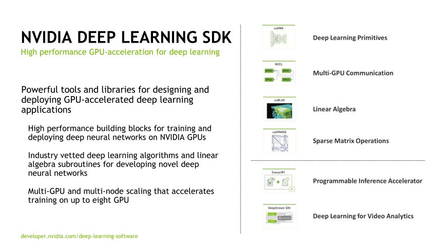 当然除了DGX和NGC之外,还要考虑怎么使用GPU为深度学习加速?这里NVIDIA提供了DIGITS、深度学习框架以及深度学习的SDK。
