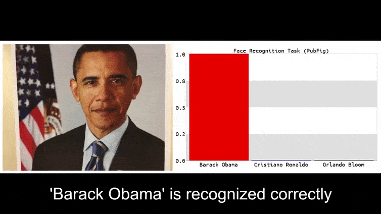 在这个动图里,一个明显会辨认奥巴马的人脸识别系统被骗了,它认为一个脸上打码的男人举着一朵花(人工合成的对抗图片)有 80% 的可能性也是奥巴马。这个系统甚至完全没管这个“假脸”是长在了男人的胸上而不是脖子上。