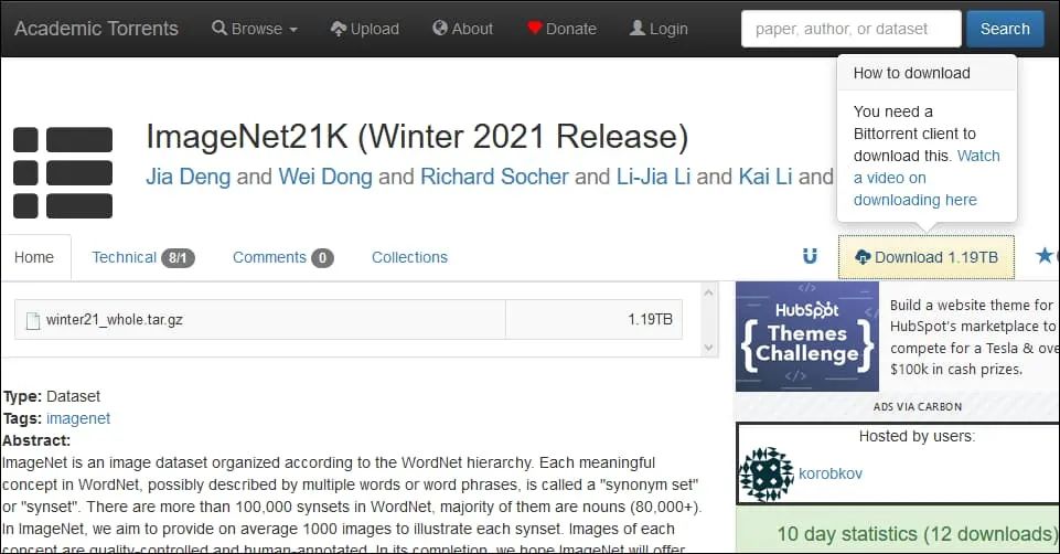 举例来说,计算机视觉数据集中的传奇经典,ImageNet,它的所有迭代版本都可以在 Torrent 里下载,免去了原网站设置的各种 限制条件,还让 验证集 这类 ML 模型训练需要的次要元素更易获得。