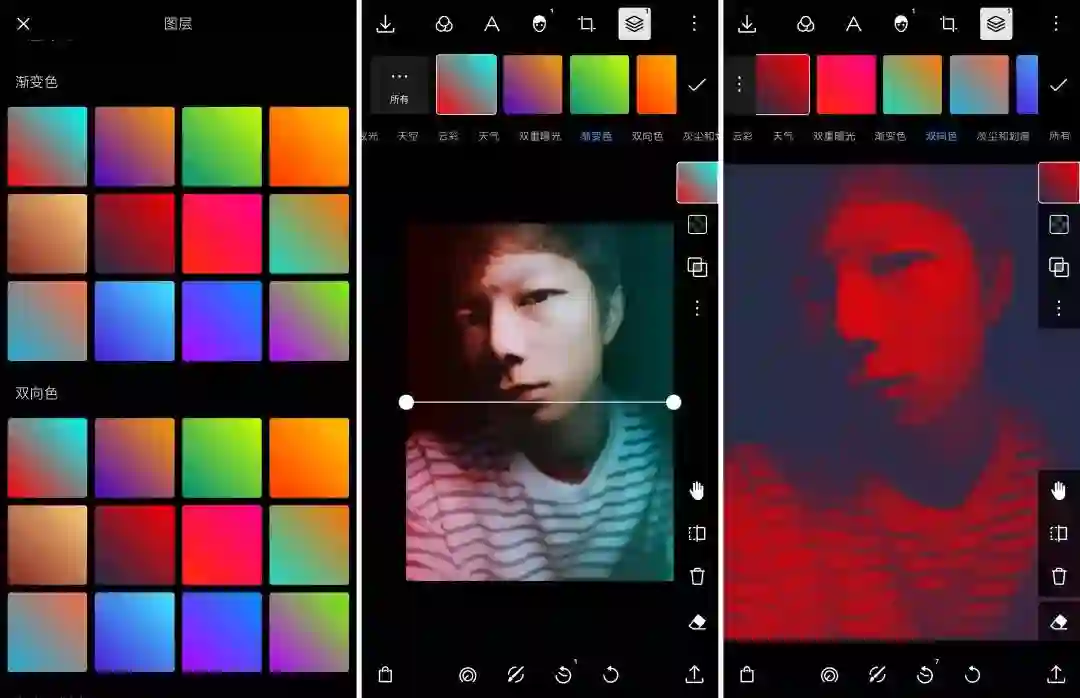 其中,渐变色可以为照片添加一种颜色渐变到另一颜色的色彩效果,营造出奇妙的对比,十分抢眼。而双向色的效果则能分离画面的高光和阴影部分,分别为它们加入不同的色彩,是非常好用的调色工具。