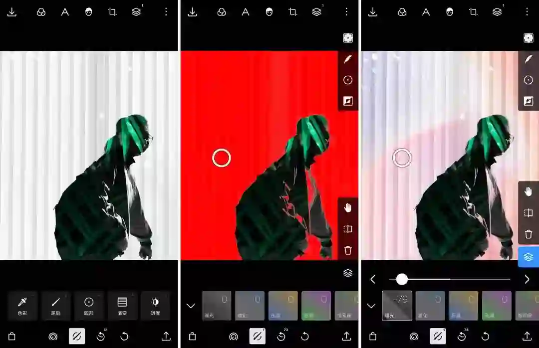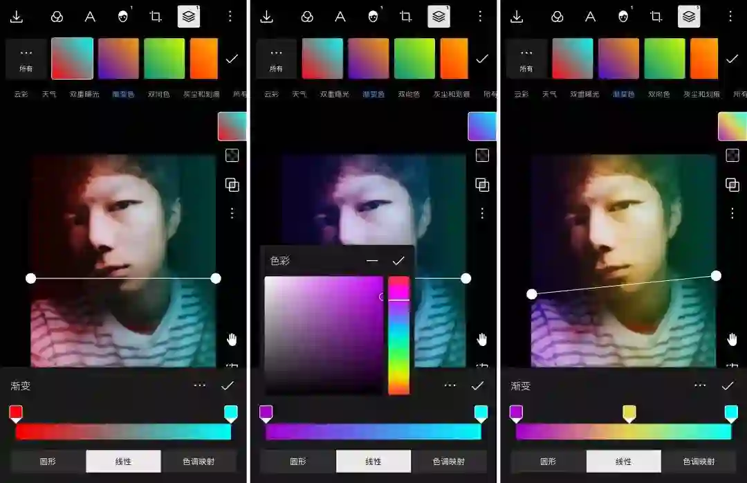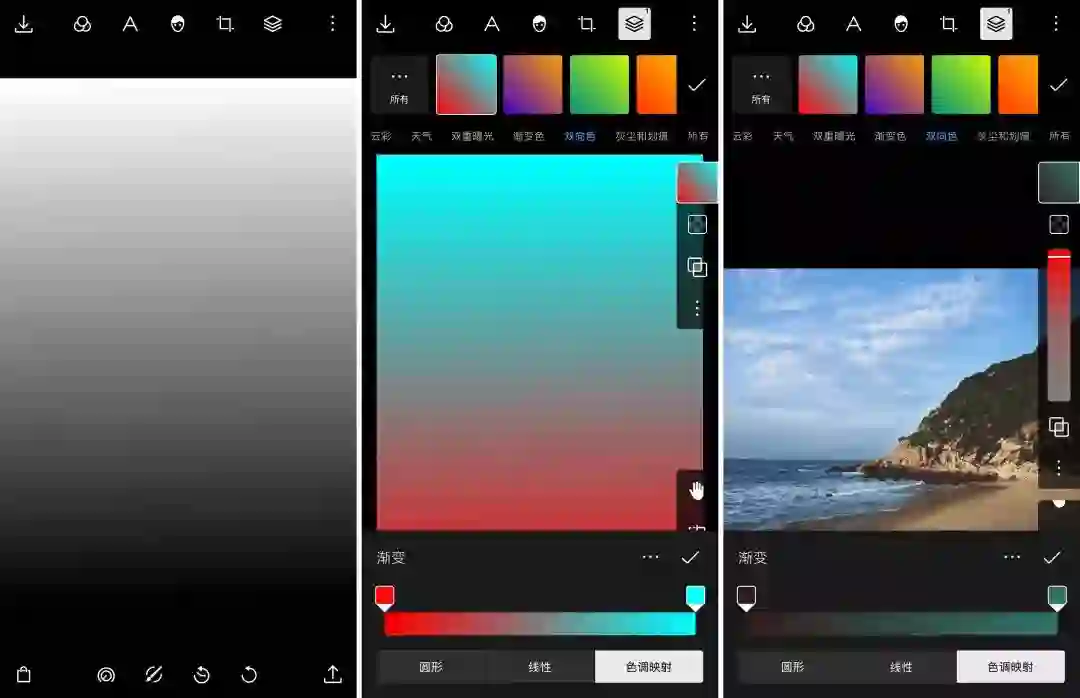 同时,在这个界面下也可以调节渐变的属性,泼辣修图目前提供了三种属性——圆形、线性以及色调映射。前两种在其他 App 中也十分常见,相信大家都比较熟悉了。而第三种「色调映射」的效果即是双向色的效果,相比起前两种,则更加精准,也更加灵活,它可以根据画面的不同亮度,分别为它们应用不同的颜色,滑杆左端代表的是阴影,即画面中较暗的地方,右端代表高光,即较亮的地方。色调映射结合混合模式,在调色时是一个非常强大的工具。