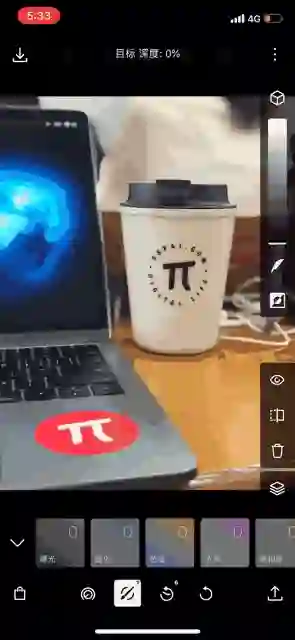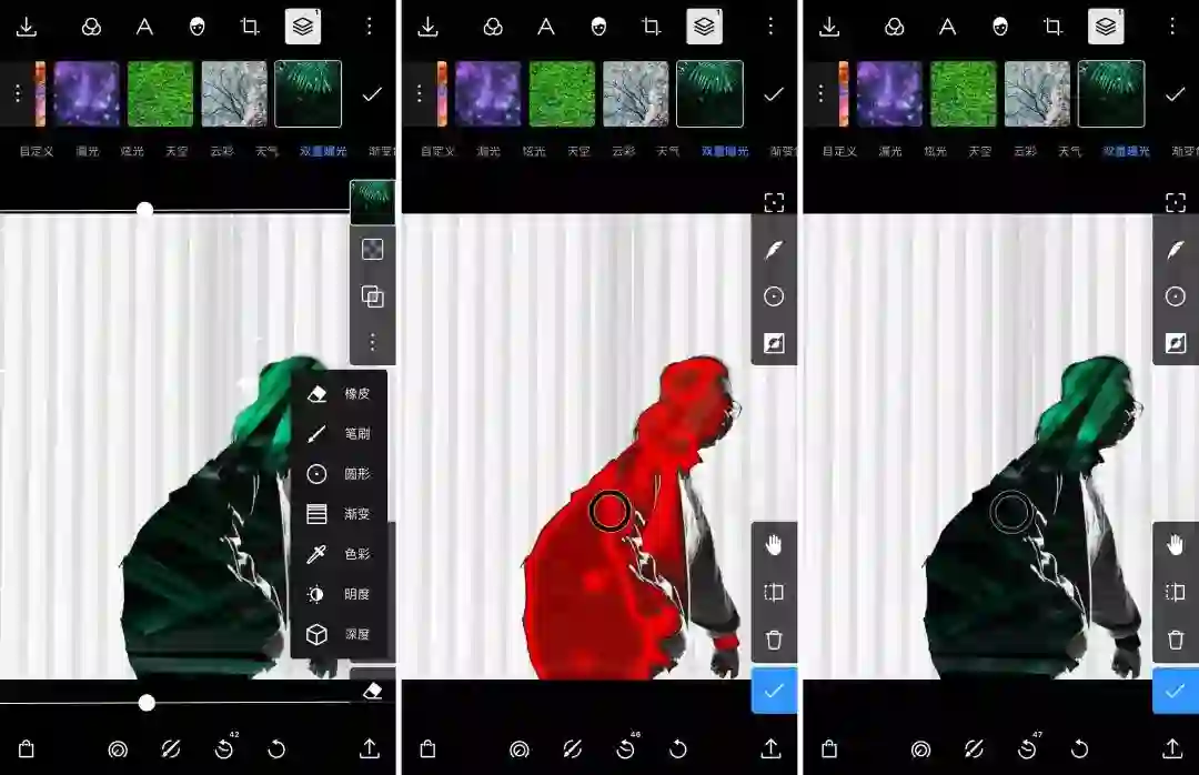 而得益于泼辣修图强大的蒙版功能,即使素材和照片有部分不搭的区域,将其消除也不一定需要大费周章地手动涂抹。你可以通过圆形、渐变、色彩以及明度等工具,甚至依靠深度信息来选择素材应用的范围。
