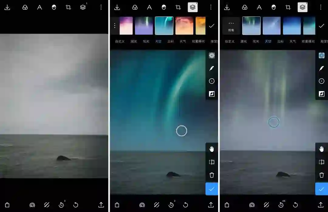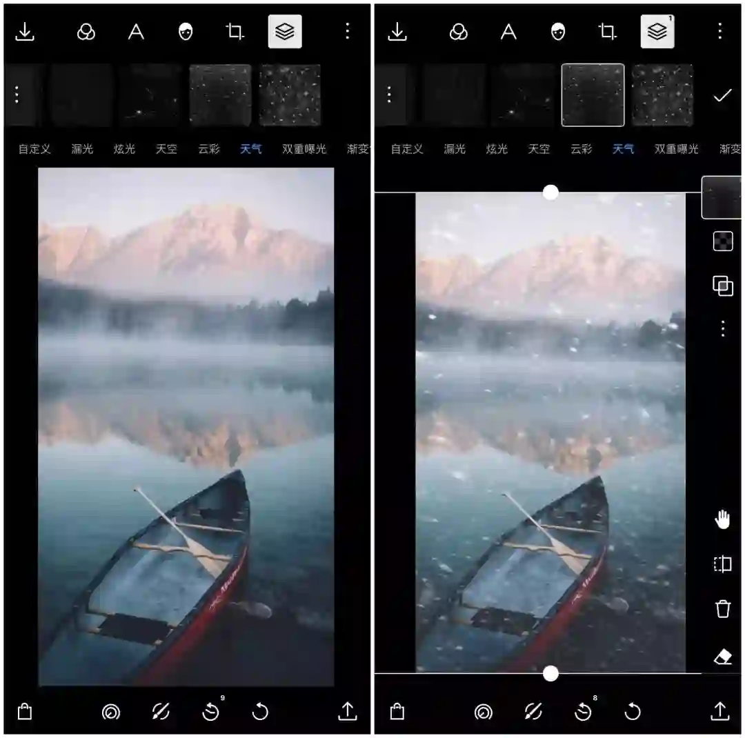 除了色彩层,泼辣修图还内置了丰富的炫光、天空、云彩以及天气素材,而且质量都十分不错,效果逼真,边缘自然,通过简单调整,就能和照片完美融合,打造惊艳朋友圈的美照。