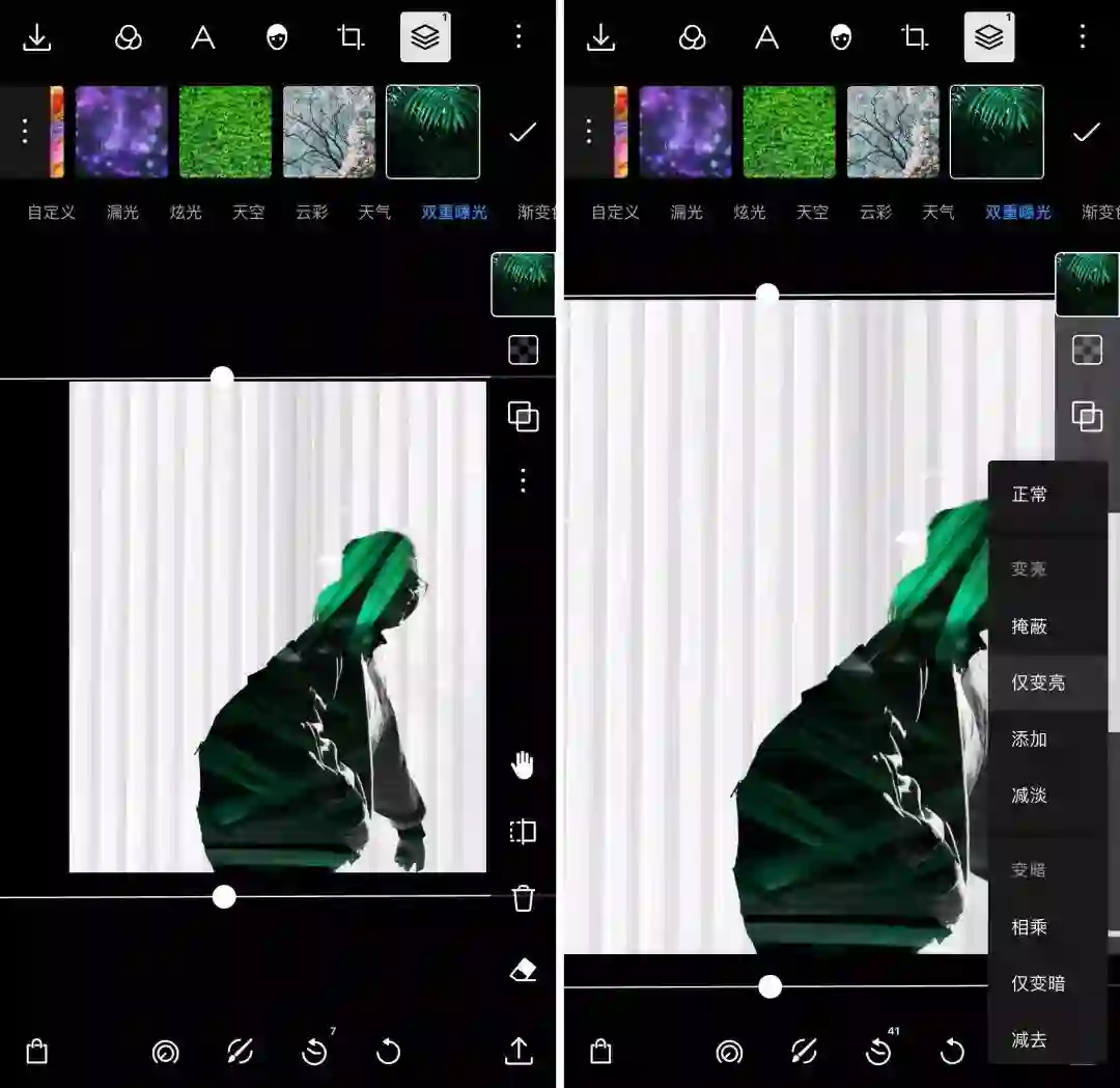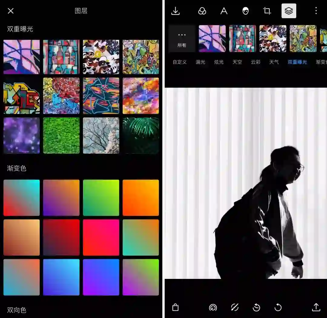 图层概念的引入带来的第一大新功能是双重曝光。尽管这一功能在同类 App 中已不是什么新鲜事了,但经过我的体验,我发现泼辣修图中的双重曝光还是有着可圈可点之处。