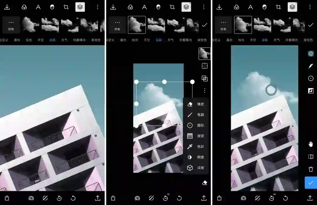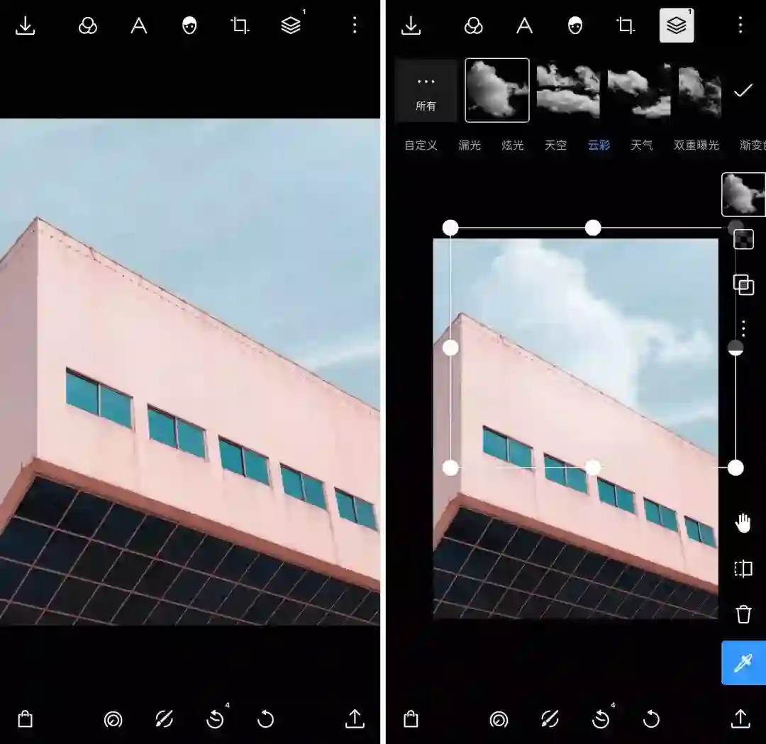 类似于双重曝光,你同样可以通过泼辣修图的蒙版功能,来快速选择素材应用的范围,以消除素材与照片冲突的地方。比如对于这张照片,只要通过选色工具选择天空,云彩就不会出现在建筑物上。