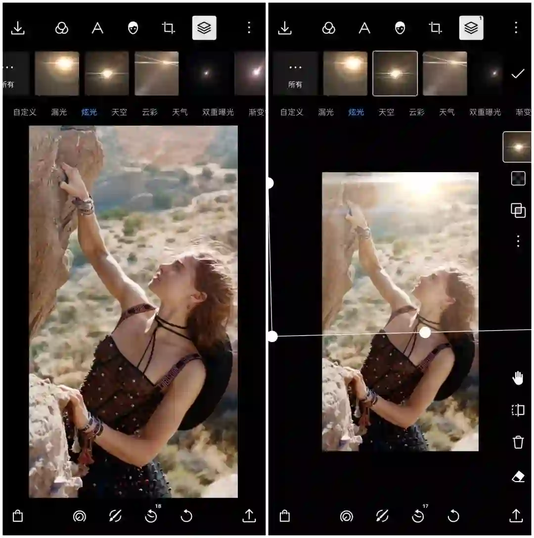 其中,炫光能够模拟逆光时产生的效果,特别适合人像摄影,能够拉大整张照片的格局以及提升氛围。添加素材之后,你可以拉伸大小、调整混合模式以及透明度,来使特效与画面更加契合。