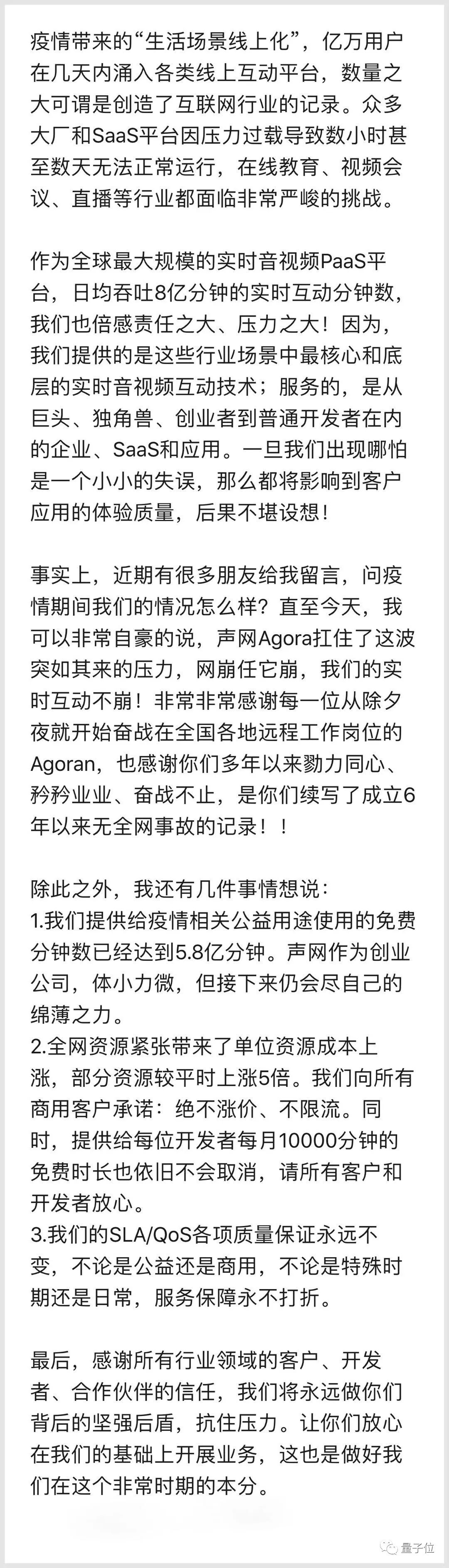 在多家平台都出问题的时候,有一家RTC技术PaaS服务提供商不仅服务一直保持稳定,而且没有降级、也没有限流。这就是前文提到的声网Agora,2月17日晚声网创始人&CEO赵斌的一条朋友圈也证实了这一点。他提到,声网在此次疫情中扛住了压力,续写了成立6年以来无全网事故的记录。