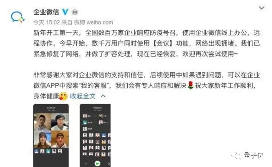 随后,企业微信向媒体回应称,企业微信会议功能访问量激增,出现短暂限流情况。企业微信团队已做紧急修复,并做了扩容保障,恢复该功能。