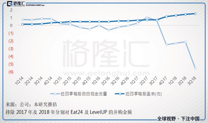 GRUB获利非常好看之外,若排除2017年及2018年分别对Eat24及LevelUP的大额并购,其自由现金流量也基本上与公司获利同步成长,体现了公司高速成长的同时,也兼顾获利成长。
