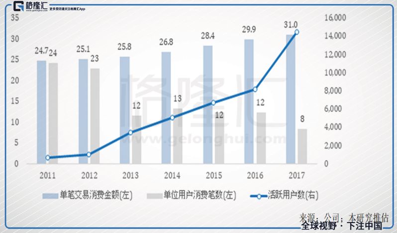 图十八、GRUB营收变动因子;单笔交易消费金额(左轴),美元;单位用户消费笔数(左轴),次数/年;活跃用户数(右轴),数量(年);